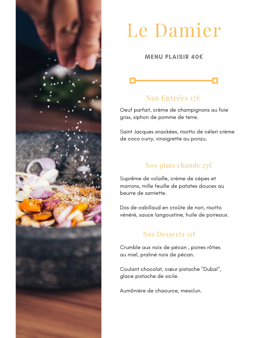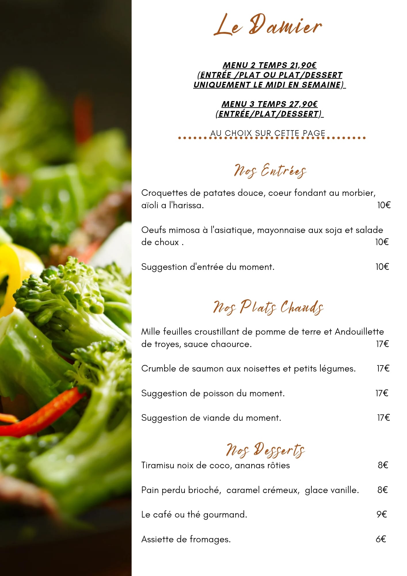 Reserve onlineUne soirée agréable avec des plats faits maison ? – Nos plats sont fraîchement préparés dans une ambiance accueillante. Au restaurant « LE DAMIER », nous vous offrons des recettes délicieuses dans une ambiance chaleureuse. Savourez nos spécialités et découvrez la grande diversité de ces plats. Notre salle climatisée vous assurent un agréable moment. Qu’il s’agisse d’un important déjeuner d’affaires ou d’un simple déjeuner dehors avec des collègues, notre menu de midi pourra vous satisfaire.